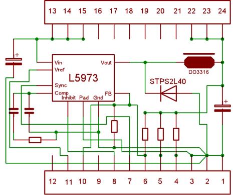 Das Regler-IC “L5973AD” arbeitet mit einer Schaltfrequenz von 500 kHz und einem Tastverhältnis von 0% .... 100%. Der Schaltregler regelt die Spannung auch ohne Ausgangsstrom.