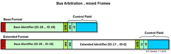 Für den Fall, dass an einem CAN Bus System sowohl Nodes mit dem „Base Format“ als auch mit dem „Extended Format“ arbeiten, kann nach dem 11-ten ID Bit (also ID18) eventuell noch keine Entscheidung über die Busvergabe getroffen werden da zwei Units mit den gleichen „Base-IDs“ möglich bzw. erlaubt sind.