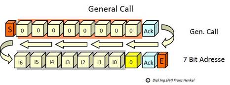 Die “GENERAL CALL” Adresse “0000.0000” ist eine Adresse die einen “Broadcast” auf dem Bus ermöglicht. Wird diese Adresse verwendet, kann an alle Busteilnehmer eine gemeinsame Nachricht oder gemeinsame Daten gesendet werden, vorausgesetzt der jeweilige Slave kann diese Information verarbeiten. Dies heißt im Einzelnen, jeder Baustein muss auf die Adresse “0000.0000” reagieren und das “ACKNOWLEDGE” Bit bedienen.
