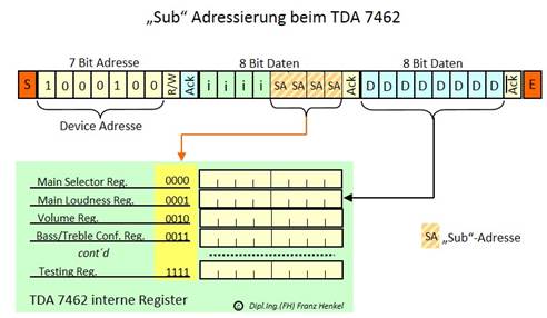 Die Funktionsweise der "Sub-Adressierung" ist dadurch gekennzeichnet, dass als erstes Datenbyte ein vom jeweiligen Baustein als Adressebyte interpretierter Wert übertragen wird, der dann ein definiertes, internes Register aktiviert. Das darauf folgende Datenbyte im Protokoll wird in diese Register geschrieben oder von diesem Register gelesen.