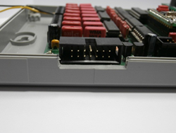 Über zwei 8-polige Leiterplattenklemmen “Conn 7” und “Conn 8” werden die leitungsgebundenen Alarmsignale an das System angeschlossen, wobei das jeweilige Eingangssignal und die dazu passende Masse auf benachbarten Klemmen liegen um einen einfachen Anschluss zu ermöglichen.