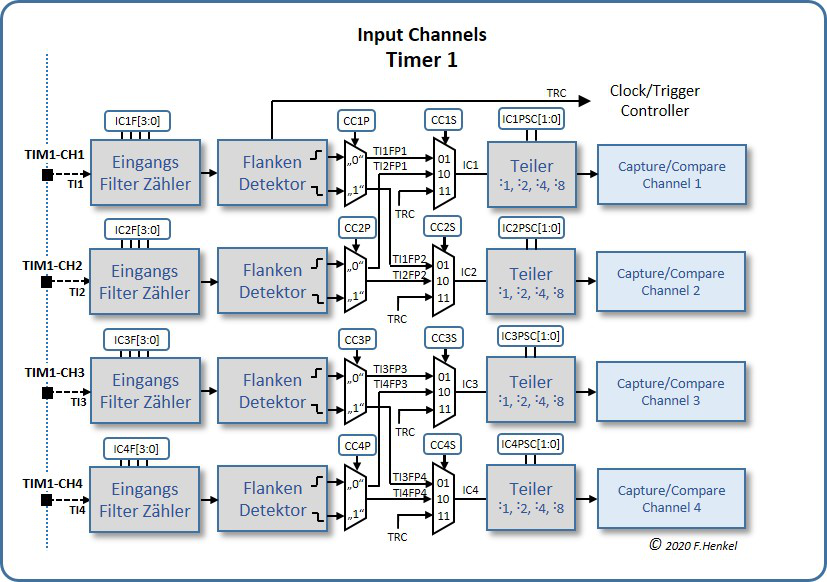 Der Timer 1 besitzt 4 Eingänge (TI1.. TI4) welche über das jeweilige CCiS[1:0] Bitfeld für die physikalischen Pins TIM1_CHi freigeschaltet werden können. Durch die CCiS[1:0] Bits wird darüber hinaus das weitere Routing des Eingangssignals über die Pfade (hier als Beispiel für Kanal 1) TI1FP1, TI2FP1 und TRC festgelegt.