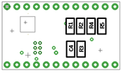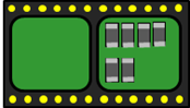Die Ausgangsspannung des AQM5973 Moduls kann über die Pins 7, 8 und 9 programmiert werden. Auf dem Basisboard auf dem das Modul aufgebracht wird sind im Layout Verbindungs-brücken nach folgendem Muster nötig.