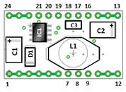 Das “Schaltregler Modul” AQM5973 ist als 24-pin Dual-In-Line Modul aufgebaut und kann in einen normalen 24-pin IC Sockel eingesteckt werden. Alle notwendigen Bauteile für den Betrieb des Schaltreglers sind auf dem Modul enthalten, lediglich bei der Entnahme höherer Ströme sollten weitere externe Kondensatoren am Eingang bzw. Ausgang des Reglers vorgesehen werden. Die Leiterplatte des Regler ist auf einem 24-pin Träger aufgelötet.