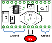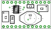 Die Hauptkomponenten sind von der Oberseite bestückt, wie das Regler-IC L5973AD, die Diode, die Leistungsinduktivität und die Ein- und Ausgangs-Kondensatoren.
