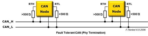 Ebenfalls im Gegensatz zum Differential CAN Bus ist eine solche Terminierung an jedem Bus-Teilnehmer (Node) vorgesehen, aber nicht zwingend notwendig. Übliche „Physical Layer“ Bausteine für einen „Fault Tolerant CAN“ bieten gesonderte Anschlüsse für die Referenzpegel der Terminierungswiderstände, diese Anschlüsse sind in der ISO Spezifikation definiert als RTH und RTL.