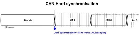 Im „Bus Idle“ Zustand werden keine Informationen übertragen und der Bus bleibt im rezessiven Zustand. Der Beginn eines Übertragungsrahmens wird durch einen Übergang vom „rezessiven“ („1“) Zustand in den „dominanten“ („0“) Zustand gekennzeichnet, damit wird sowohl eine Synchronisation auf den Übertragungsrahmen als auch eine Synchronisation der Bit-Subschritte (Time Quanten) auf den Anfang des ersten übertragenen Bits möglich.