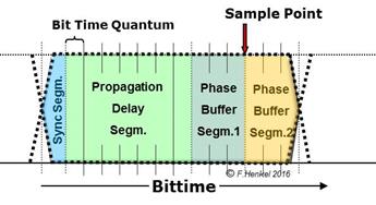 Eine Bit-Zeit wird in 4 Segmente mit einer unterschiedlichen Anzahl von „Zeit-Quanten“ unterteilt. Diese Segmente sind: Sync-Segment, Propagation-Delay-Segment, Buffer-Phase1-Segment, Buffer-Phase2-Segment .
