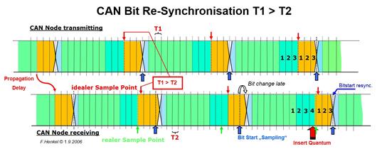 Arbeitet der Sender mit einem geringfügig langsameren Takt, so verschiebt sich der Bitübergang auf einen späteren Zeitpunkt. Summiert sich der Fehler auf ein ganzes Bit-Quantum bei der Abtastung so wird im Phase Buffer Segment 2 ein Bit Quantum zusätzlich zu der im CAN Controller programmierten Zahl von Bit-Quanten eingefügt.
