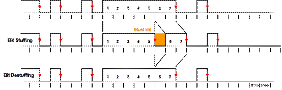 Ein Empfänger würde nach fünf übertragenen „0“en oder „1“en, ein Bit mit einem komplementären Pegel erwarten. Trifft das nicht zu, so wird dem Empfänger ein besonderer Zustand signalisiert.