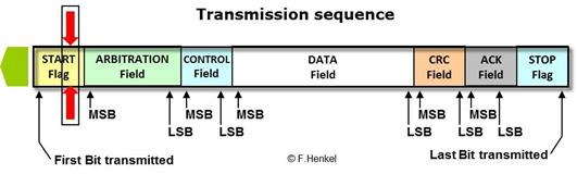 Nach den Vereinbarungen innerhalb der Bit-Übertragungsschicht und dem Data Link Layer besteht jetzt grundsätzlich die Möglichkeit Daten auf dem CAN Bus zu übertragen. Dazu muss eine Bus-Einheit mit dem Senden eines Rahmens beginnen.
