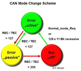 Jede einzelne CAN Node kann im normalen Betrieb verschiedene Modi durchlaufen. Auslöser für Übergänge zwischen einzelnen Modis ist die von der eigenen Node überwachte Fehlerhäufigkeit. Unglücklich von der Begriffswahl ist der Standard-Betriebsmodus der „Error Active“ Modus. Dabei bezieht man sich auf den Begriff „active“ als aktiv überwachende und Fehler signalisierende Einheit.