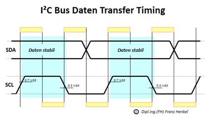 Jedes Bit innerhalb eines zu übertragenden Bytes wird durch einen “SCL”-Puls übermittelt. Dabei sind die Daten auf dem Bus stabil wenn die Takt-Leitung einen “High”-Pegel einnimmt und die Daten können sich ändern wenn die Taktleitung auf “Low”-Pegel ist.