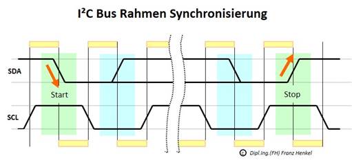 Jedes zu übertragende Paket (nicht Byte) auf dem I²C Bus beginnt mit einer “START” Kondition und endet mit einer “STOP” Kondition. In den