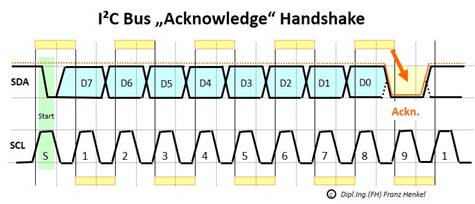 Zusätzlich zu jedem übertragenem Byte wird ein “ACKNOWLEDGE” Bit übertragen, das vom jeweiligen Empfänger (kann Master oder Slave sein) den Empfang des gerade übertragenen Bytes quittiert. Dabei erzeugt der Master zu den 8 Takt-Impulsen einen zusätzlichen Takt und der zuletzt aktive Baustein der die Daten empfangen hat zieht die Datenleitung bei diesem "neunten" Takt auf “Low”. Dieses “ACKNOWLEDGE” Verfahren ist laut Spezifikation vorgeschrieben.