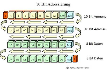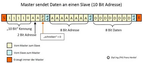 Die "10-Bit" Kennung zu Beginn des ersten Bytes aktiviert im Slave den 10-Bit Adressmodus. Danach wird die eigentliche Adresse aus den beiden Adressbits des ersten Bytes und den 8 Bit des zweiten Bytes zusammengesetzt.