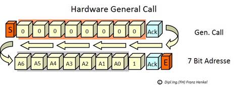 Die “GENERAL CALL” Adresse “0000.0000” ist eine Adresse die einen “Broadcast” auf dem Bus ermöglicht. Wird diese Adresse verwendet, kann an alle Busteilnehmer eine gemeinsame Nachricht oder gemeinsame Daten gesendet werden, vorausgesetzt der jeweilige Slave kann diese Information verarbeiten. Dies heißt im Einzelnen, jeder Baustein muss auf die Adresse “0000.0000” reagieren und das “ACKNOWLEDGE” Bit bedienen.