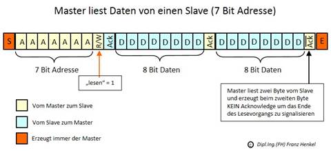 Da sich die Datenübertragungs-Richtung umkehrt, muss der Slave (der zu lesende Baustein) die Daten auf dem Bus mit dem externen Takt bereitstellen und der Master quittiert über die jeweiligen "ACKNOWLEDGES" nach jedem Daten-Byte den Empfang.