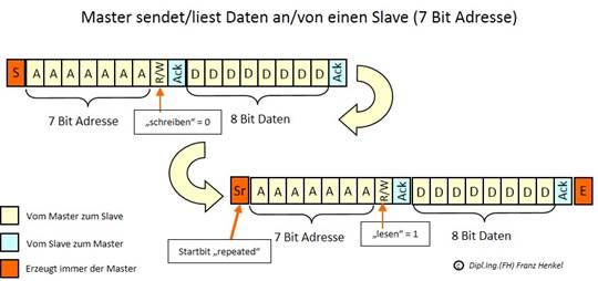 Mit der erneuten "Start" Kondition ( "repeated Start" ) wird ein neuer Adress-Zyklus gestartet. Als Adresse wird die vorher angesprochene "Slave"-Adresse verwendet, allerdings wird jetzt das "Read/Write" Bit auf "Lesen" gesetzt und das erste Byte von diesem Baustein gelesen. Damit werden die Daten vom Slave zum Master übertragen. Dieser Vorgang ist auch umkehrbar und es kann zuerst von einer Adresse gelesen und danach geschrieben werden.