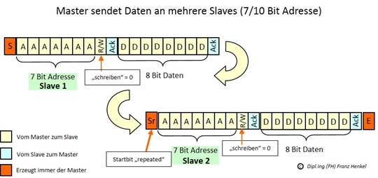 Für den/die Slave/s an einem I²C-Bus ist dieser Vorgang transparent, d.h. der Slave erkennt eine "Start" Kondition und interpretiert das darauf folgende Byte als Adresse, ganz gleich ob es sich dabei um eine normale oder eine wiederholte "Start" Kondition handelt. Die Adresse wird dekodiert und die darauf folgenden Daten übernommen.