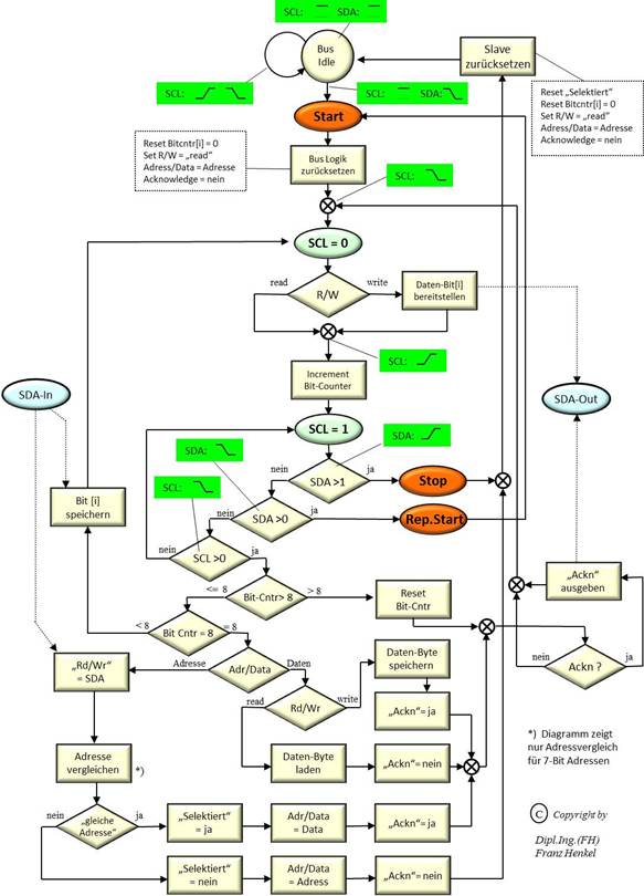 Jeder Adress-Zyklus startet mit einer "Start" Kondition (oder "repeated Start" Kondition, was eigentlich dasselbe ist). Jeder I²C-Baustein löscht sein Eingangs-Register und erwartet das erste Byte, das wie beschrieben eine Adresse ist.