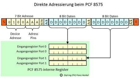 Direkte Adressierung heißt in diesem Fall, das Port 0 des Bausteins wird durch das erste Datenbyte im I²C-Protokoll und Port 1 durch das zweite Datenbyte im I²C-Protokoll angesprochen. Es liegt als eine feste Zuordnung der einzelnen Datenbytes im Protokoll zu den physikalischen Registern im Baustein vor.
