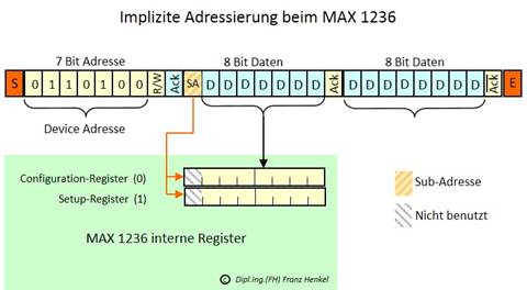 Wenn es sich um nur wenige Register handelt, wie beispielsweise beim MAX1236 der Firma Maxim, einem 12-Bit A/D-Wandler mit Analogmultiplexer, der jeweils ein Register für die Konfiguration bzw. den Setup besitzt, kann die Adressierung der Register Teil des Datenbytes selbst sein.