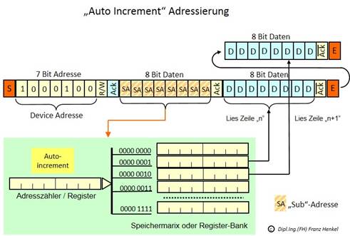 Die Funktionsweise der "Sub-Adressierung" ist dadurch gekennzeichnet, dass als erstes Datenbyte ein vom jeweiligen Baustein als Adressebyte interpretierter Wert übertragen wird, der dann ein definiertes, internes Register aktiviert. Das darauf folgende Datenbyte im Protokoll wird in diese Register geschrieben oder von diesem Register gelesen.