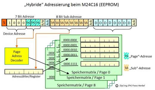 Bei dem schon mehrfach erwähnten Baustein M24C16 (16 kBit) werden die 3 Bit aus der I²C-Adresse als Page-Select (Bank Select) benutzt und die "Subadresse" als Adresse innerhalb der Page. Die Bausteinvarianten M24C08 (8kBit) , M24C04 (4 kBit) benutzen nur zwei , bzw. eines der I²C Adressbits. Der noch kleineren Speicher M24C02 (2kBit) verwendet dagegen keine "Hybride Adressierung" da die 8-Bit Adresse (Subadresse) ausreicht um die 256x8Bit Speichermatrix zu adressieren.