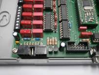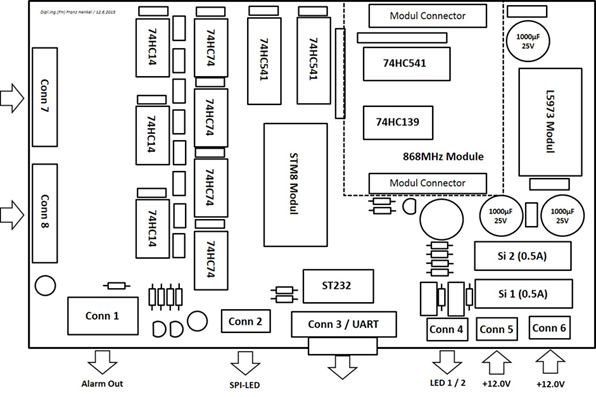 Über zwei 8-polige Leiterplattenklemmen “Conn 7” und “Conn 8” werden die leitungsgebundenen Alarmsignale an das System angeschlossen, wobei das jeweilige Eingangssignal und die dazu passende Masse auf benachbarten Klemmen liegen um einen einfachen Anschluss zu ermöglichen.