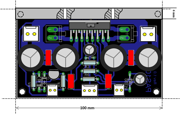 Diese Audio-Komponente ist auf einer einseitigen Leiterplatte aufgebaut und enthält folgende Funktionen für einen Stereo Leistungsverstärker: