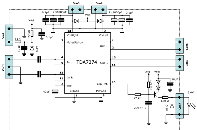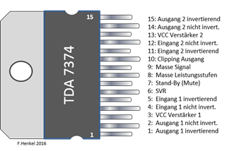 Der integrierte Stereo-Leistungsverstärker TDA 7374 im „Multiwatt 15“ Gehäuse ist auf eine Aluminium-Schiene montiert die zur mechanischen Stabilität und zur Wärmeableitung dient. Das Aluminium-Profil (25mm x 6mm) muß im Betrieb mit einem weiteren Kühlkörper oder einem Gehäuse-Chassis zur vollständigen Wärmeableitung verbunden werden, dazu sind zwei Bohrungen vorhanden.