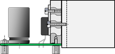 Das IC-Gehäuse ist durch eine Glimmerscheibe und eine Isolierscheibe für die Schraube elektrisch von der Montageschiene aus Aluminium isoliert.