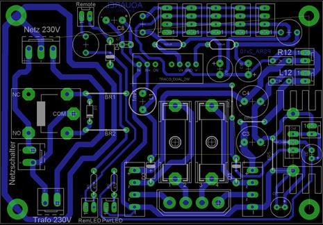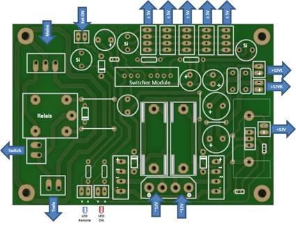 Auf dem “PSRA” Board werden diese beiden zugeführten Spannungen gleichgerichtet und in einem ersten Schritt mit Kondensatoren (100µF) geglättet. Die so erzeugten unabhängigen Versorgungs-spannungen liefern die Betriebsspannnung für zwei Audio Leistungsverstärker Kanäle (mit ca. 10 Watt).