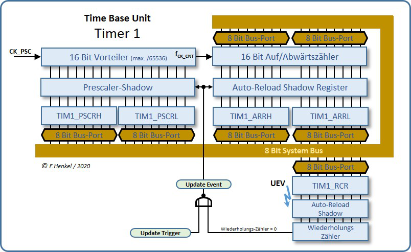 Der Timer 1 besitzt einen frei programmierbaren 16-Bit Vorteiler (Prescaler) zur Erzeugung der gewünschten Eingangsfrequenz für den 16-Bit Zähler. Mit diesem Vorteiler kann die CK_PSC Frequenz, welche aus der fMASTER Frequenz des STM8, einer externe Frequenz (TIM1_ETR bzw. TIM1_CHi) oder einer intern erzeugten Frequenz eines anderen Timers (ITRi), durch einen beliebigen Wert zwischen 1 und 65365 geteilt werden.