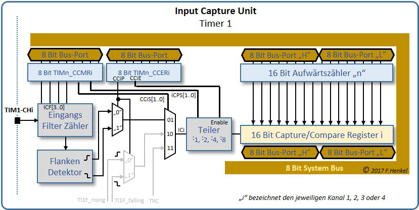 Bei einer aktiven Signalflanke an diesem Eingangs des Kanals wird der aktuelle Stand des Timer 1 Counters in das für den jeweiligen Kanal vorgesehene TIM1_CCRiH / TIM1_CCRiL Registerpaar geladen.