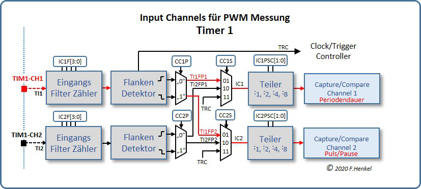 Das zu messende Signal (z.B. am TIM1_CH1 Eingang) wird auf die beiden Timer-Kanäle 1 und 2 über die Signale TI1FP1 (Kanal 1) und TI1FP2 (Kanal 2) aufgeteilt, wobei der Kanal 1 auf positive und der Kanal 2 auf negative Flanken reagiert. TI1FP1 wird nun als Trigger Signal konfiguriert und der Clock/Trigger Modus des Kanal 1 wird als „Trigger Reset Modus“ gesetzt.
