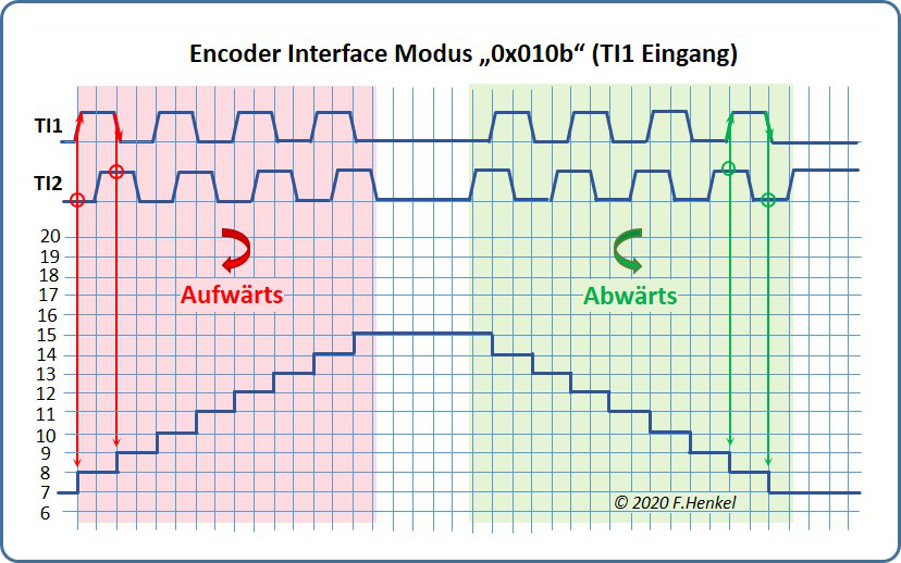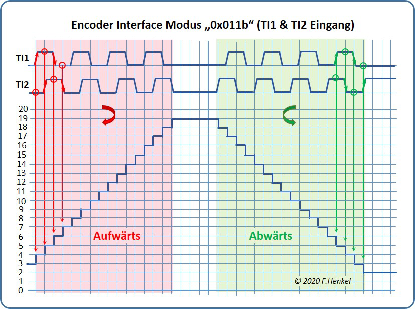 Wie dargestellt wird der Zählerstand durch beide Flanken der beiden Eingänge TI1 und TI2 verändert. Die Zählrichtung ergibt sich aus dem statischen Pegel am jeweils anderen Eingang, wobei sich die beiden Eingänge komplementär verhalten.